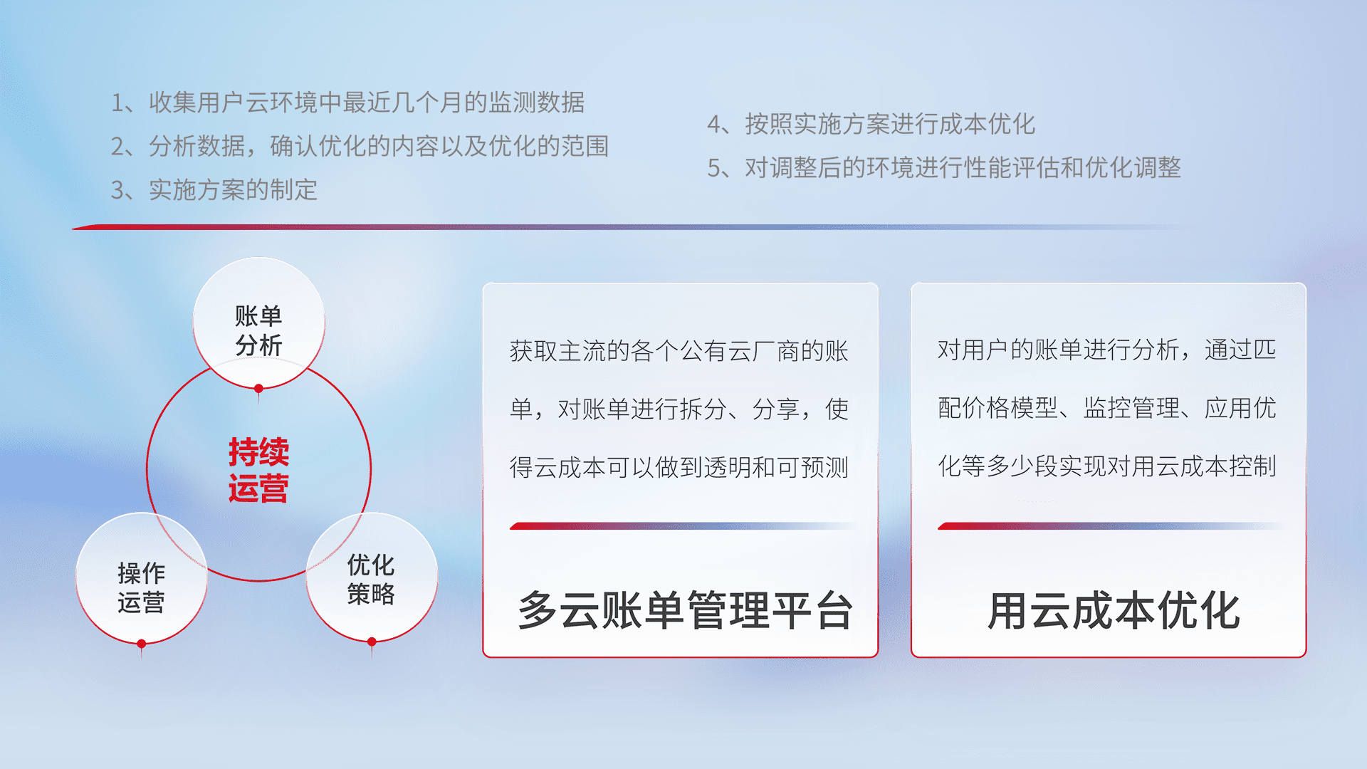 通过多云纳管,,,以统一的资源数据模型把客户的云资源进行抽象和封装,,进而实现对多云资源的统一操作,,,保障云资源管理的可靠性、、、、稳定性与可用性。。量身定制化运维内容,,,,配置、、、、开发运维、、、、补丁管理、、、备份、、、、监控、、、、认证和访问管理、、审计和日常巡检等,,,保障在用云过程中的可靠度,,,,稳定度以及高可用率。。
